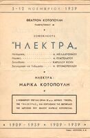 Δίπτυχο φυλλάδιο. Στη μία του όψη διαφημίζεται η παράσταση 'Ηλέκτρα' του Σοφοκλή, από τον θίασο Μαρίκας Κοτοπούλη σε σκηνοθεσία του καρόλου Κουν και σκηνικά/ κοστούμια του Νίκου Εγγονόπουλου.