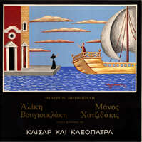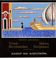 Πρόγραμμα της παράστασης Καίσαρ και Κλεοπάτρα του Μπερναρντ Σω, στο Θέατρον Μαρίκα Κοτοπούλη, τη χειμερινή περίοδο 1962-1963. Η σκηνοθεσία ανήκει στον Αλέξη Σολομό, η μουσική στον Μάνο Χατζιδάκι, τα σκηνικά και τα κοστούμια στον Νίκο Εγγονόπουλο και πρωταγωνιστεί στον ομώνυμο ρόλο η Αλίκη Βουγιουκλάκη. Οι διαστάσεις του προγράμματος είναι 22 x 22 εκ..